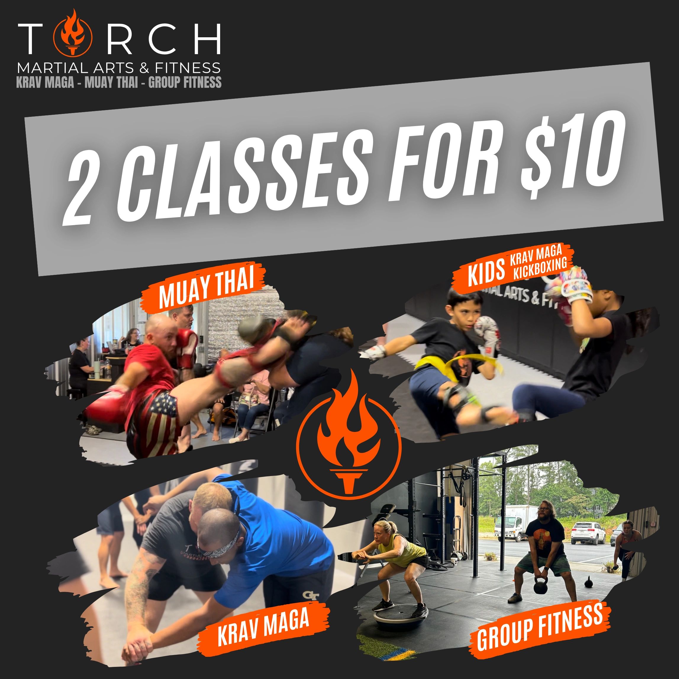 For just $10, you can jump into 2 powerhouse classes at Torch Martial Arts & Fitness! Choose from Krav Maga, Muay Thai, or TorchBody, and discover what real self-defense and fitness feel like. No experience? No problem. Just $10 for 2 classes to kickstart your journey. Let’s go!