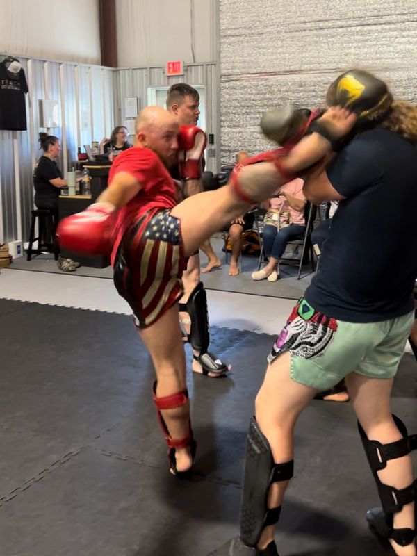 Muay Thai students spar within the rules of Muay Thai Kickboxing. Elbows are only allowed for advanced students designated by the instructor.